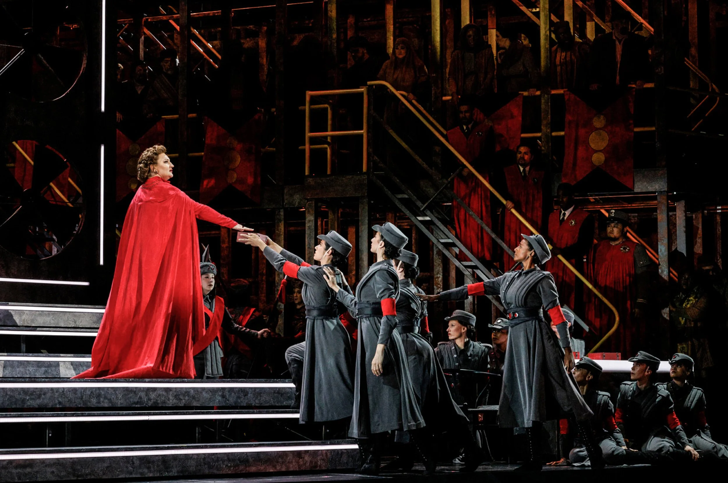 "The sets by Wilson Chin evoke various 20th-century totalitarian regimes with the grim spectacle of a joyous dance by young women in drab gray clothes and red armbands, a Shostakovich-esque irony. A tangle of pipes and stairs evocative of a factory, or perhaps a prison, make up the main set, creating a closed-off feeling that only opens up with Turandot’s heart does the same in the finale."– Andrew Lindermann Malone, Washington Classical Review